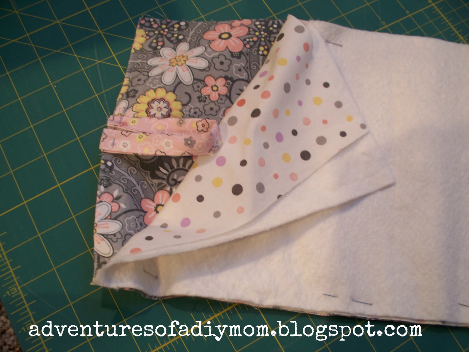 Now lay out your pieces and pin together. Place one larger piece of fabric face up, then pin the button loop to it like shown. Next lay down your other fabric face down {so right sides are together} Then place batting on top. Pin to secure and then sew around the whole thing leaving a section open to turn it right side out. Then top-stitch around the entire rectangle.
