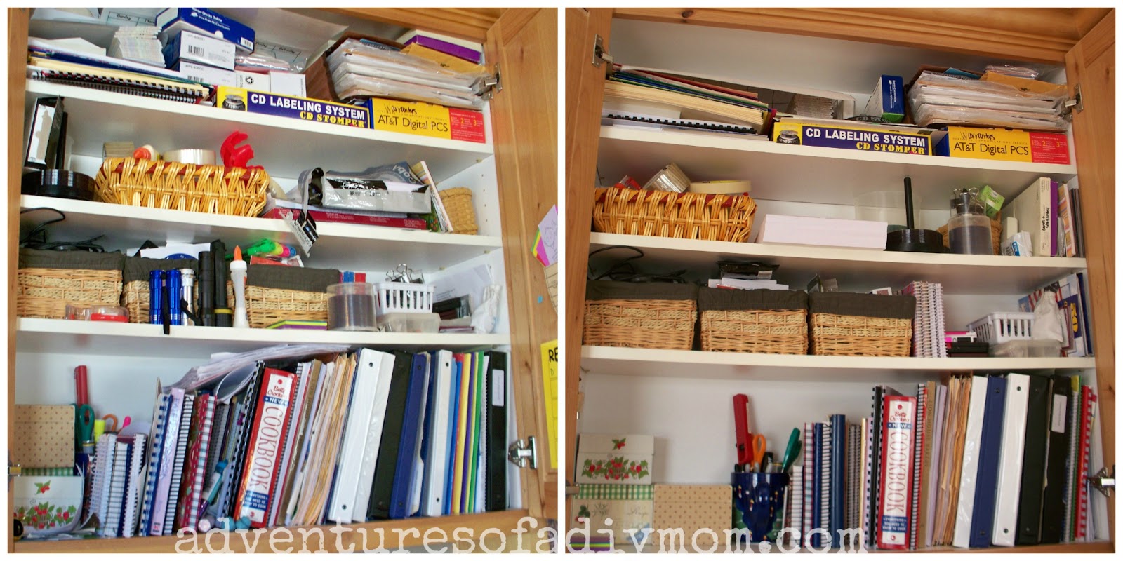 This is the cabinet is kind of a catch all. I went through all my recipes. Before there was such a thing as Pinterest, I would print out any recipe I thought looked good. I probably have only tried about 5% of them. I went through them all and threw away lots that I knew I would never try, and kept the ones that still looked good. Other than that I just reorganized it all and threw away random things that were no longer needed. This took me about an hour to organize and another hour to go through the recipes. Way too much time! But next time, I'll be able to straighten it up quickly.